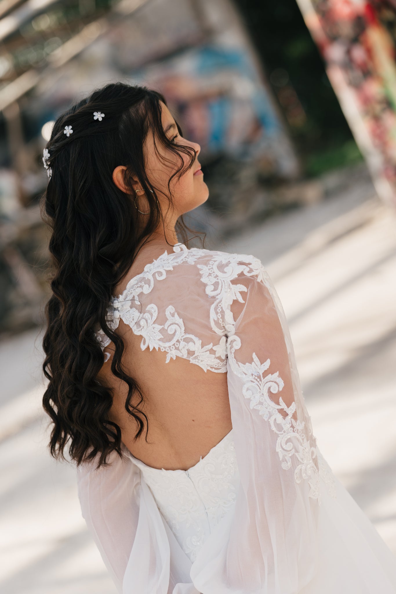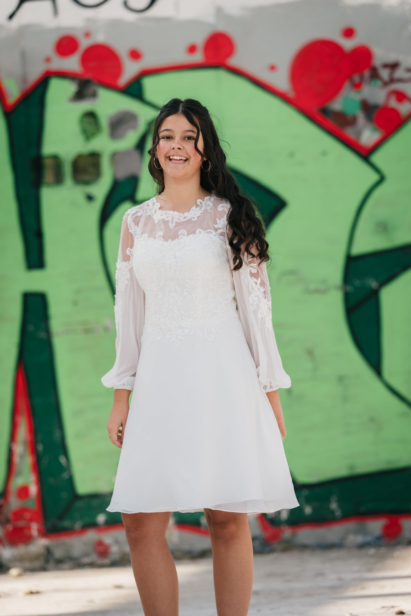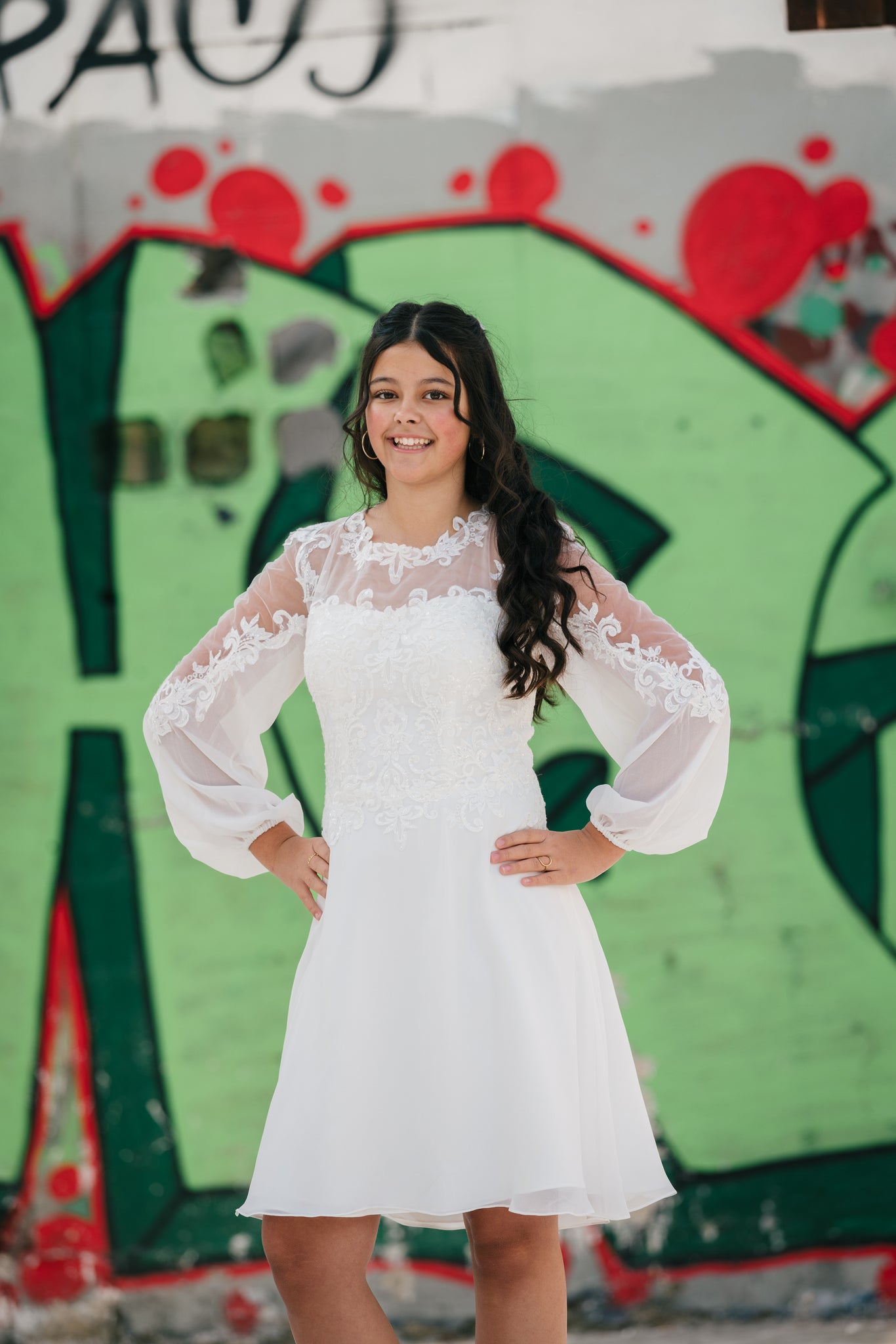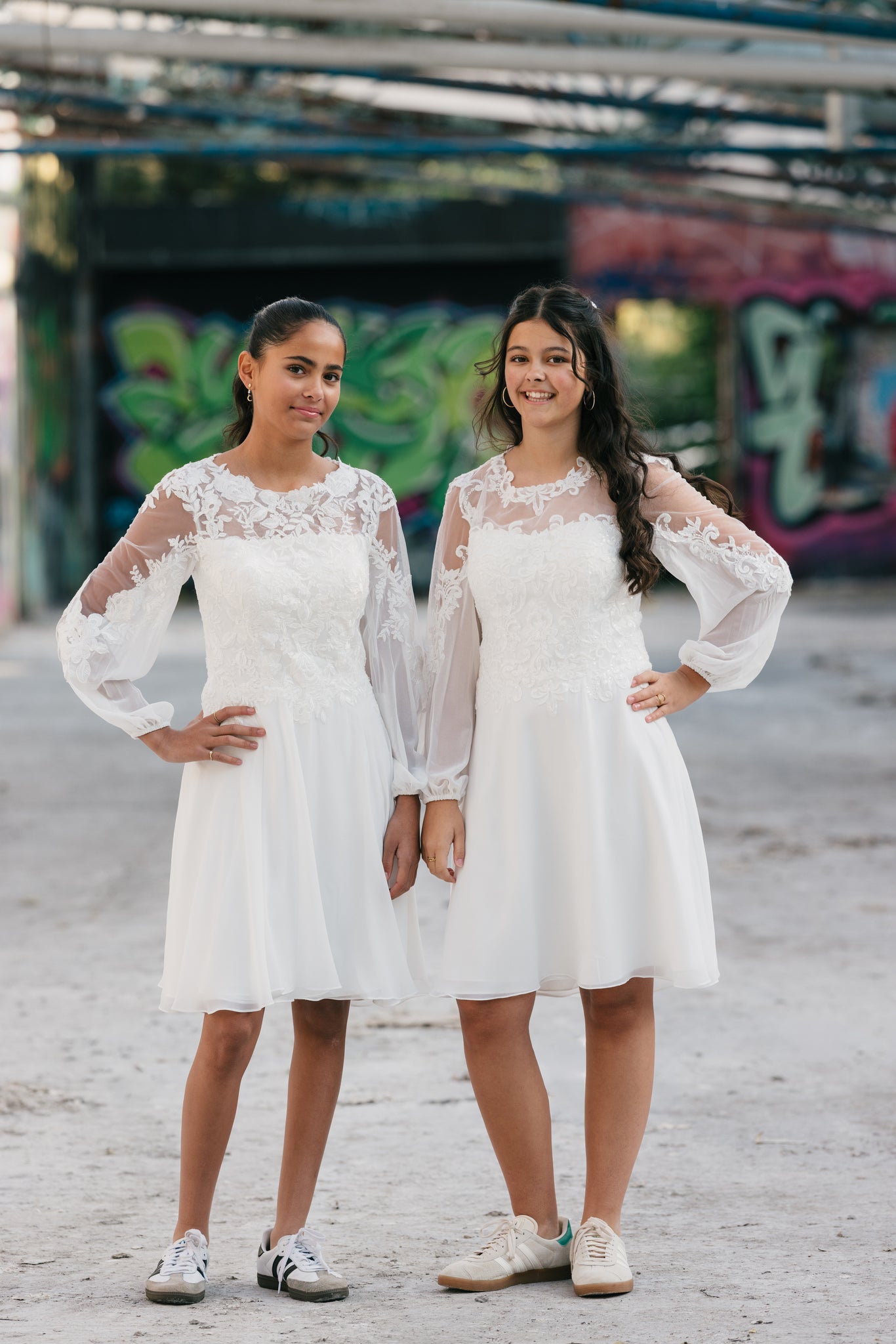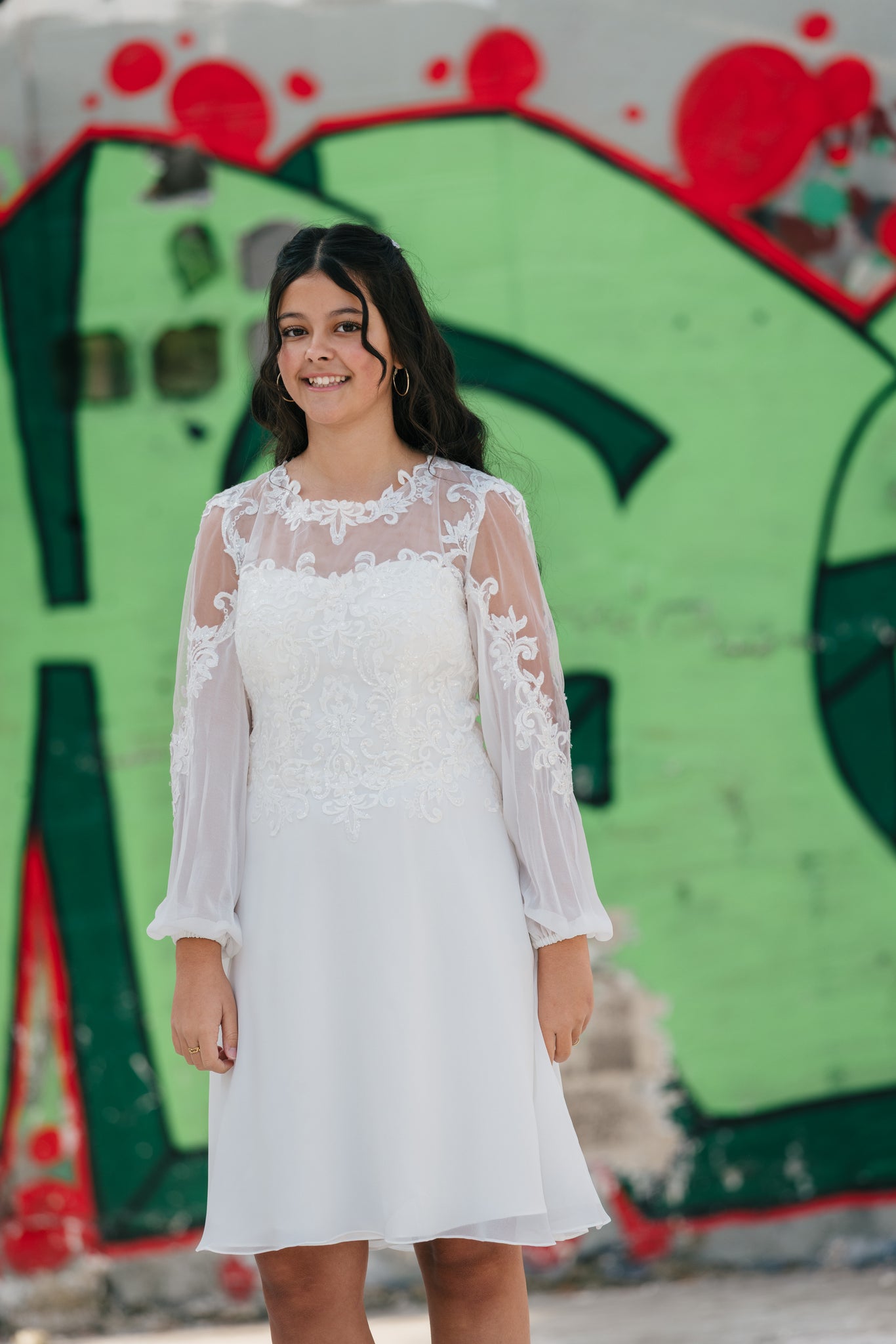 Elegant konfirmationskjole i chiffon og blonde med transparente ærmer og et klassisk snit. Isabella er enkel, feminin og tidløs – perfekt til konfirmationen 2026.