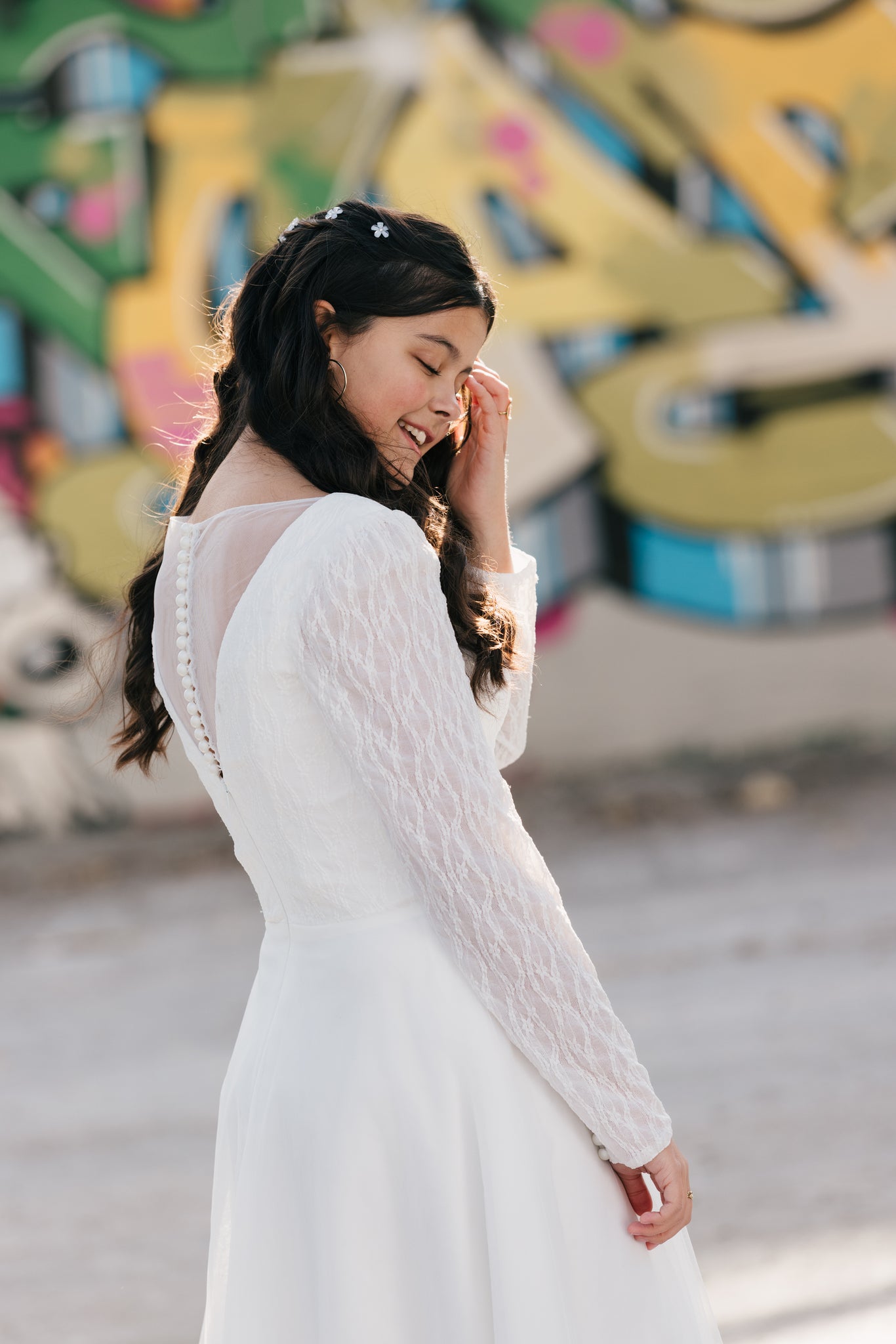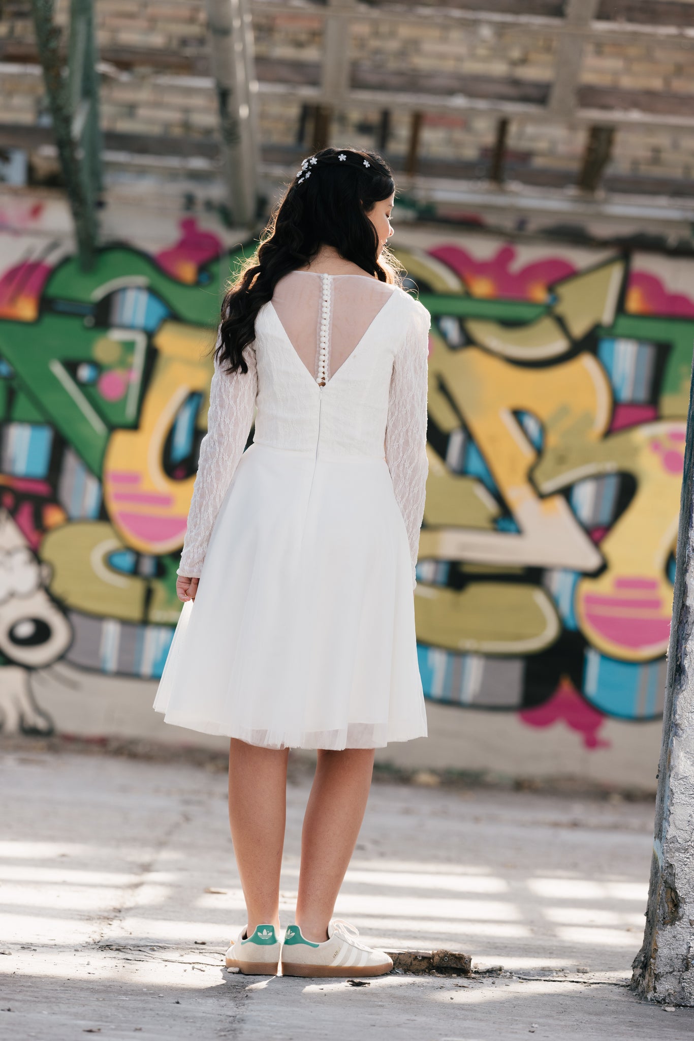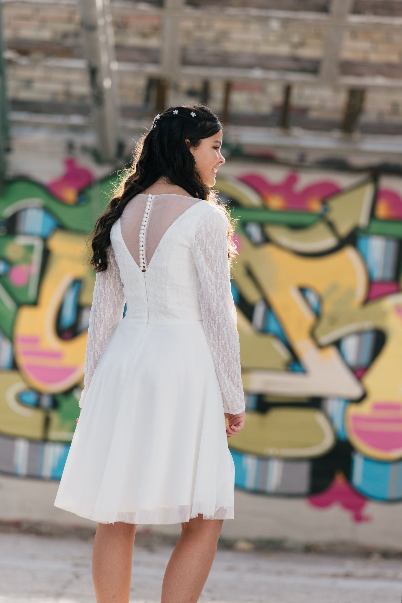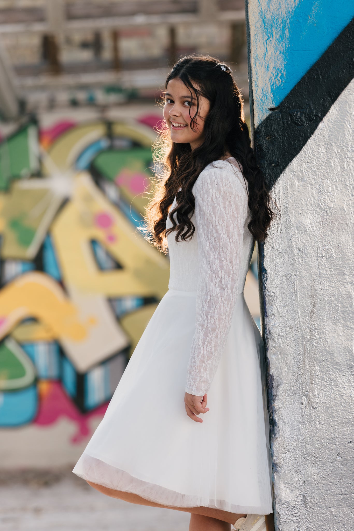 Konfirmationskjolen Viola er en elegant og tidløs kjole med tylskørt og smukke blondeærmer. Den enkle overdel og de fine detaljer skaber et romantisk og feminint udtryk.
